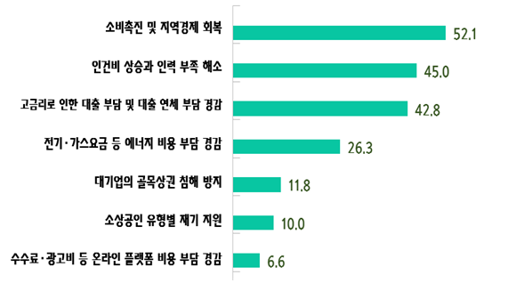 올해 국회나 정부에서 해결해야 할 최우선 과제로는 △소비촉진 및 지역 경제 회복(52.1%) △인건비 상승·인력 부족 해결(45%) △고금리로 인한 대출 부담 완화(42.8%) △에너지 비용 부담 완화(26.3%) 순으로 응답했다.