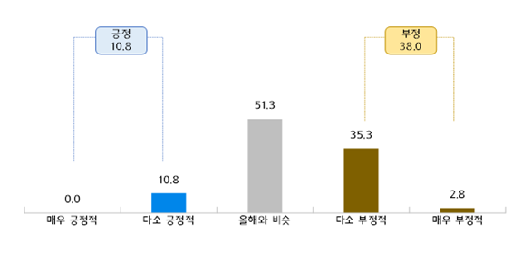 ▲ 2026년 경영전망(단위: %, 출처: 중소기업중앙회)고물가·내수 부진에 이어 최근 고환율까지 겹쳐 소상공인의 경영 환경이 갈수록 어려워지는 가운데, 소비쿠폰 등 단기적 소비 촉진과 장기 성장 정책의 병행이 요구되고 있다.