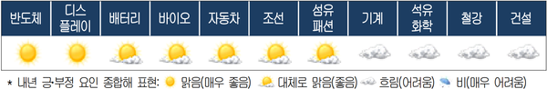대한상공회의소(회장 최태원)는 11개 주요 업종별 협회와 함께 분석한 ‘2026년 산업기상도’를 15일 발표했다. 조사에 따르면, 반도체·디스플레이는 ‘맑음’, 배터리·바이오·자동차·조선·섬유패션 산업은 ‘대체로 맑음’, 기계·석유화학·철강·건설은 ‘흐림’으로 전망됐다.