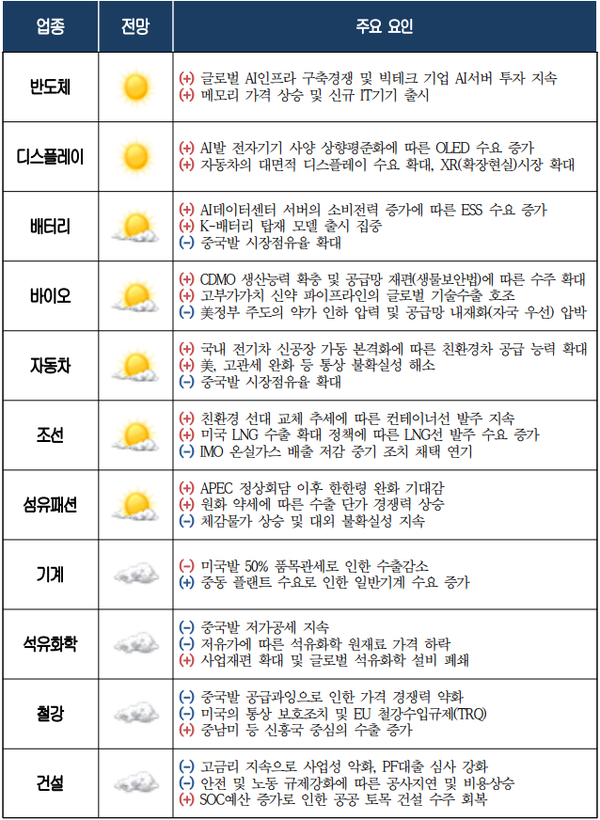 섬유패션산업 역시 ‘대체로 맑음’이다. APEC 이후 중국의 한한령 완화 기대, K-콘텐츠의 글로벌 확산에 따른 고부가 패션 상품의 수요 증가, 원화 약세로 인한 가격 경쟁력 등으로 ’26년 수출은 올해대비 2% 증가한 99.6억 달러를 기록할 전망이다. 다만, 체감물가 상승 및 대외 불확실성에 따른 내수·교역 둔화는 여전히 불안 요소로 지적됐다.