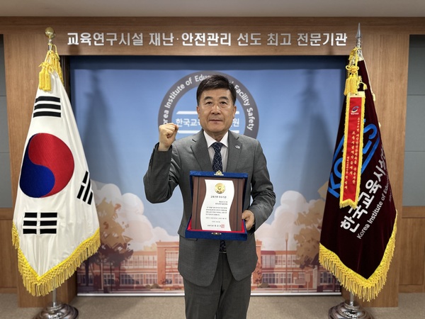 ▲ 한국교육시설안전원 허성우 이사장이 교육기부 우수기관 인증패를 들고 기념사진을 촬영 중이다.한국교육시설안전원(이사장 허성우, 이하 안전원)이 학생들의 실질적인 안전역량 향상을 위한 프로그램을 운영해 전문성과 지속가능성을 인정받았다.