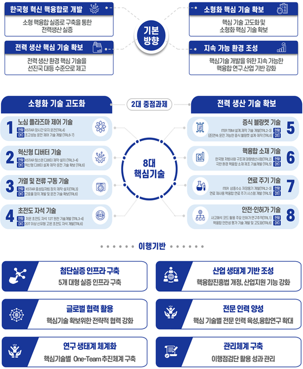 정부는 이번 로드맵에 따라 ‘한국형 혁신 핵융합로(전력생산 실증로)’ 개발에 착수하고, 핵융합에너지 전력생산에 필수적인 8대 핵심기술 확보를 추진한다. 이를 통해 기존에 ’50년대로 설정돼 있던 우리나라의 핵융합에너지 전력생산 목표를 ’30년대로 전력생산 실증을 앞당겨 핵융합에너지 선도 국가로 도약하겠다는 비전을 제시했다.