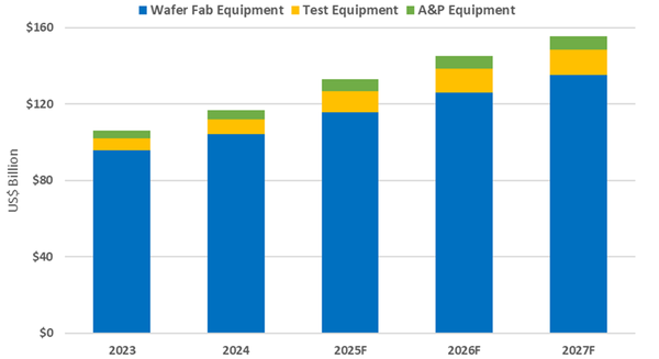 세부적으로 보면 웨이퍼 팹 장비(WFE) 부문은 ’24년 1,040억달러로 사상 최대를 기록한 데 이어, ’25년에는 11% 증가한 1,157억달러에 이를 것으로 예상됐다. 이는 기존 중간 전망치보다 상향된 수치로, AI 연산 수요 확대에 따른 DRAM 및 HBM(고대역폭 메모리) 투자 증가와 중국 내 생산능력 확충이 반영됐다.