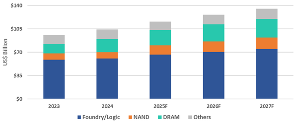메모리 장비 투자 역시 HBM 수요 증가를 중심으로 큰 폭의 성장이 예상된다. NAND 장비 시장은 2025년 45.4% 증가한 140억달러, DRAM 장비 시장은 15.4% 증가한 225억달러로 전망됐다. 이후에도 ’27년까지 두 자릿수에 가까운 성장세가 이어질 것으로 보인다.