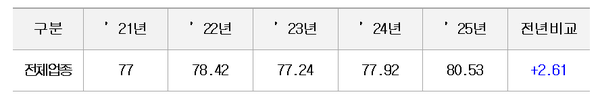 조사결과에 따르면, ’25년 전체업종의 거래공정성지수는 80.53으로, 전년에 비해 2.61점 상승한 것으로 나타났다.