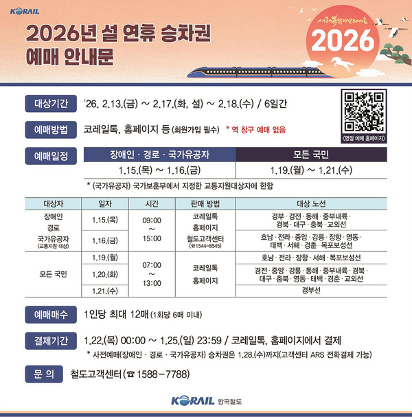 코레일(한국철도공사)은 설 연휴를 맞아 오는 15일부터 ‘2026년 설 연휴 승차권 예매’를 시행한다고 7일 밝혔다.