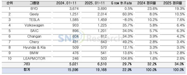 SNE리서치에 따르면 2025년 1~11월 세계 각국에 등록된 전기차 인도량은 약 1,916만8,000대로, 전년동기대비 22.9% 증가한 것으로 나타났다.