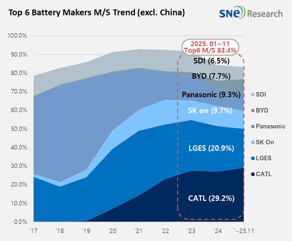 ▲ 2025년 1~11월 글로벌 배터리 제조사 시장 점유율(출처: 2025년 12월 Global Monthly EV and Battery Monthly Tracker, SNE리서치)중국을 제외한 글로벌 전기차 배터리 시장이 두 자릿수 성장세를 이어가고 있다. 다만 완성차 업체의 배터리 조달 다변화와 저가 LFP 채택 확대, 중국계 배터리사의 글로벌 침투가 맞물리며 한국계 3사의 시장 점유율은 하락해, 성장 국면 속 경쟁 압력은 오히려 강화되고 있다.