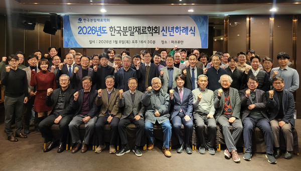 한국분말재료학회(회장 이기안 인하대 교수)는 지난 8일 서울 강남구 파크루안에서 ‘2026년 한국분말재료학회 신년하례식’을 개최했다. 이날 행사에는 이기안 회장과 역대 회장을 맡은 이재성 한양대 교수, 김진천 울산대 교수, 유지훈 한국재료연구원 박사 등 산학연 회원 60여명이 참석했다.