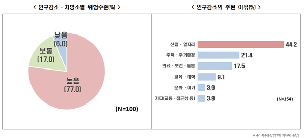 비수도권 시·군 지자체 10곳 중 7곳 이상이 인구감소와 지방소멸 위험을 심각하게 인식하는 가운데, 산업·일자리 부족이 핵심 원인으로 지목되며 기업 유치와 일자리 확충을 중심으로 한 구조적 대응이 절실한 것으로 보인다.