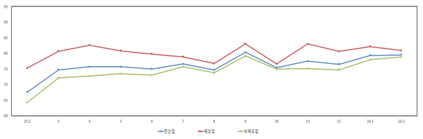 기업유형별로 일반 제조업(77.8%→75.3%)은 전월 대비 2.5%p, 혁신형 제조업(78.3%→75.9%)은 전월 대비 2.4%p 하락했다.
