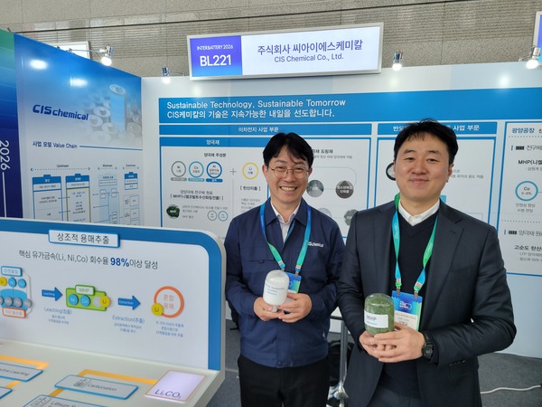 CIS케미칼(대표 이성오)은 11일부터 13일까지 코엑스에서 열리는 국내 최대이자 대표적인 국제 배터리 전시회인 ‘인터배터리 2026’에 부스를 마련하고, 회사가 국산화에 성공한 △탄산리튬(Li2CO3), △MHP(복합수산화침전물) △Pure-MHP(무공침 전구체) 등 이차전지 양극재 원료 소재 제품군을 선보였다.