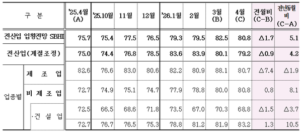 중소기업중앙회는 지난 3월 13일부터 19일까지 3,057개 중소기업을 대상으로 실시한 ‘2026년 4월 중소기업 경기전망조사’ 결과, 업황전망 경기전망지수(SBHI)가 80.8로 전월 대비 1.7p 하락했다고 30일 밝혔다.