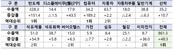 이러한 수출 호조는 반도체(328억달러, 전년동월대비 151%), 자동차(64억달러, 2.2%), 석유제품(51억달러, 55%), 석유화학(39억달러, 6%), 선박(35억달러, 11%), 컴퓨터(34억달러, 189%), 무선통신(18억달러, 44%), 바이오(15억달러, 6%), 이차전지(9억달러, 36%), 섬유(8억달러, 3%) 등 15대 주력 수출품목 중 10개 품목 수출이 증가한데 따른 것이다.
