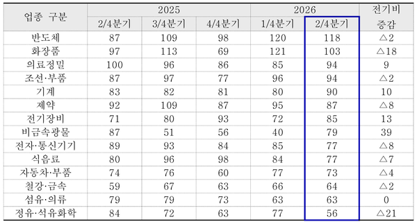 업종별로는 반도체와 화장품이 비교적 견조한 흐름을 보였다. 반도체(118)는 글로벌 AI 인프라 투자 확대 영향으로 2분기 연속 기준치를 상회하며 긍정 전망이 이어졌다. 화장품(103)은 전분기 대비 하락했음에도 여전히 개선 기대가 우세했다.