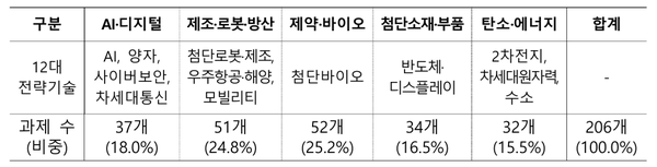 이번 공모는 12대 전략기술 분야를 중심으로 진행됐으며 5대 전략기술 그룹 단위로는 △제약·바이오 분야에 52개(25.2%) △제조·로봇·방산에 51개(24.8%) △AI·디지털에 37개(18.0%) 등 총 206개 접수 과제에 1,183개 기업·연구소 등이 참여를 신청했다.