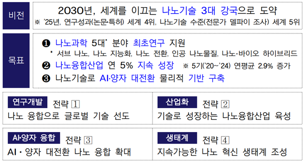 정부가 2030년 나노기술 글로벌 3대 강국 도약을 위해 나노과학 3대 분야 최초연구 지원, 나노소재 신공정 기술개발 지원, AI·양자 대전환 등 R&D, 산업화, 생태계 구축을 종합적으로 추진한다.