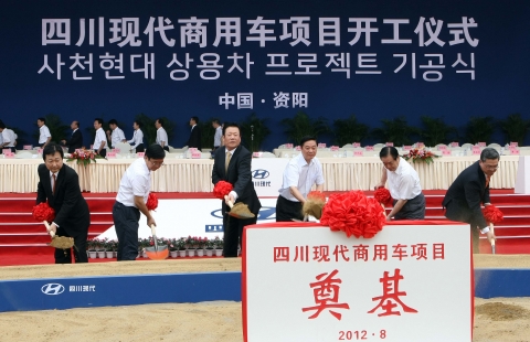 현대자동차(회장 정몽구)는 28일 중국 쓰촨(四川)성 쯔양(資陽)시 일대에서 ‘쓰촨현대기차유한공사(四川現代汽车有限公司, 이하 쓰촨현대)’ 상용차 공장 착공식을 갖고, 공장 설립을 위한 첫 삽을 떴다.
