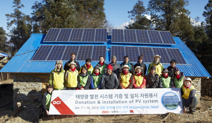 OCI는 지난 13일, EWB-KAIST(KAIST 봉사단체 ‘국경 없는 엔지니어 모임’)와 공동으로 네팔의 안나푸르나에 위치한 모하르단다 지역에 2.6kW급 태양광발전설비를 설치했다. 이 태양광발전설비는 KAIST가 현지 사용에 적합하도록 자체 개발한 급수시설과 기상관측시스템, Wi-fi 릴레이 스테이션(인터넷기지국) 등에 전력을 공급한다.