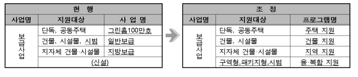 이번 개편안의 주요내용을 살펴보면 보급사업에 융·복합지원이 신설되고 기존 기존 사업체계가 주택지원, 건물지원, 지역지원으로 개편된다.