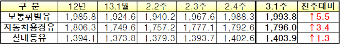 한국석유공사(사장 서문규)는 3월 첫째 주 휘발유가격이 전주대비 5.5원 오른 1,993.8원/ℓ을 기록했다고 밝혔다. 경유는 3.4원 오른 1,796원/ℓ을 기록했다.