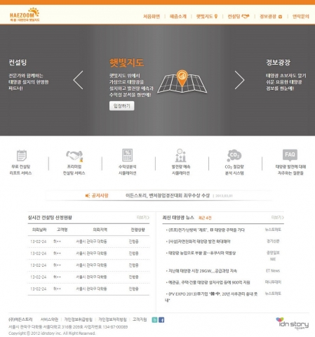 (주)이든스토리(대표 권오현)는 태양광 발전으로 발생하는 수익성을 분석해주는 사이트 ‘대한민국 햇빛지도 해줌(HAEZOOM)’을 국내 최초로 오픈했다고 12일 밝혔다.