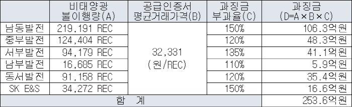 업체별 과징금 규모는 불이행량에 신재생에너지 공급인증서(REC) 평균거래가격을 곱해 산정한 후 가중사유와 감경사유를 가감해서 최종 산정했다.