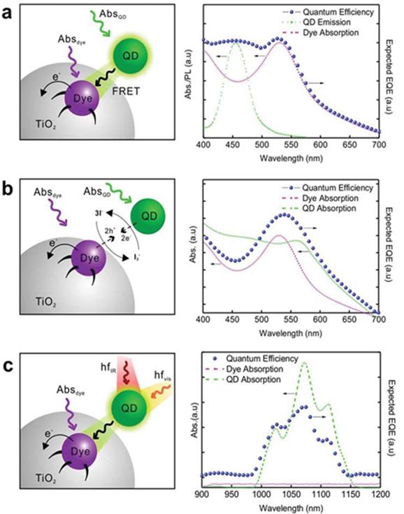이러한 난제를 타개하기 위해 연구팀은 빛 흡수를 높이는 방법으로 염료감응 태양전지의 전해질에 양자점을 분산시켜 빛 산란층과 플라스몬 구조 없이도 9%대의 고효율을 달성했다.
