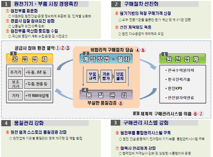 현재 거래가격기준의 가격기준이 원가기반 가격으로 바뀌고 다수기업과 사전 단가계약을 체결하는 다수공급자 계약제도가 도입된다. 또한 원전 부품의 규격·구매·재고·정비 등을 파악할 수 있는 종합정보시스템과 함께 납품업체의 품질관리 강화도 추진된다.