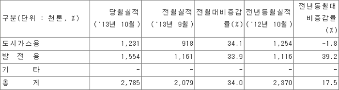 가스공사(사장 장석효)가 12일 2013년 10월 영업실적을 발표했다.