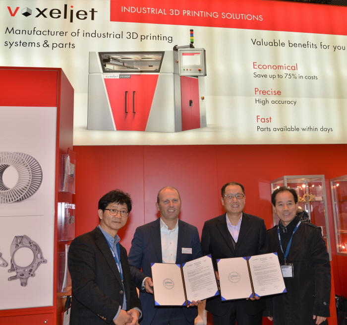 복셀제트는 1999년에 창업한 회사로 2013년 나스닥에 상장한 중견기업으로 ‘바인드 제팅’이란 독보적인 기술을 보유한 회사이다. 이 기술은 코팅된 모래를 수백 마이크로 한층을 깔고 노즐을 통해 선택적으로 접착제를 뿌려 한층한층씩 쌓아 올려 3차원적인 형상의 모래 주물틀을 제작하는 방식이다. 형상이 복잡한 금형은 물론 최대 4m까지 대형으로 출력이 가능하다. 이에 대형의 주조품도 목형이나 금형 없이 단시간에 저비용으로 제작이 가능해 국내에도 주조 회사가 사용하고 있다.