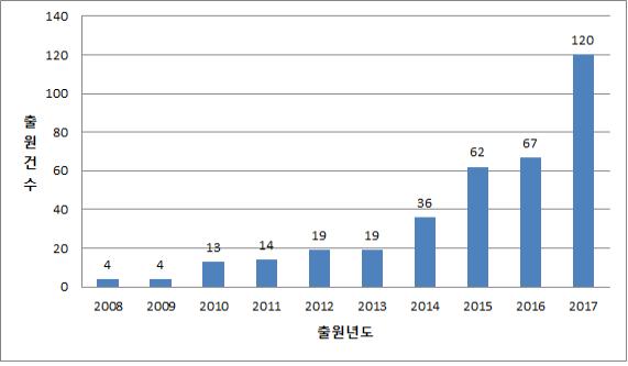 이러한 전망에 부응하듯 마이크로 LED 기술 관련 특허출원은 2012년 19건에 불과했지만 2015년 62건으로 3배 이상 크게 증가했고, 2017년에는 120건으로 2015년에 비해 2배 가까이 증가한 것으로 나타났다.