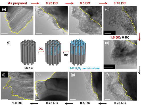 이에 연구진은 리튬과산화물의 전도성을 향상시키고 리튬-산소 전지의 성능을 높이기 위해 연구팀은 메조 다공성 탄소물질인 CMK-3를 전극으로 사용해 일차원 나노구조체를 갖는 비결정질 리튬과산화물을 생성하는 데 성공했다.