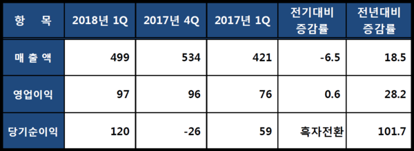 원익머트리얼즈는 최근 2018년 1분기 경영실적을 공시했다.