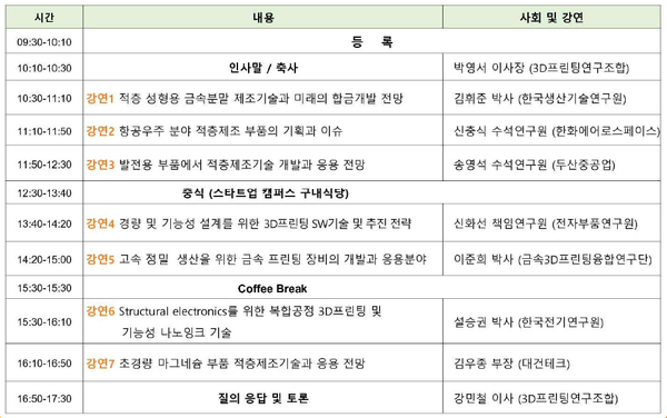 ▲ 프로그램 안내(행사문의:055-282-6646)전통제조방식으로 제조가 불가능한 부품을 맞춤형으로 보다 나은 특성을 부여할 수 있는 3D프린팅 기술이 우주항공, 발전 등 산업을 중심으로 적용분야가 확대되고 있는 가운데 국내에서 개발되고 있는 신기술과 상용화를 중점 조망하는 자리가 마련된다.