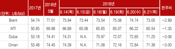 6월 3주 국제 유가는 OPEC 등 산유국들의 증산 검토와 미국에 의한 국제 무역전쟁 우려 심화 등의 영향으로 하락했다.