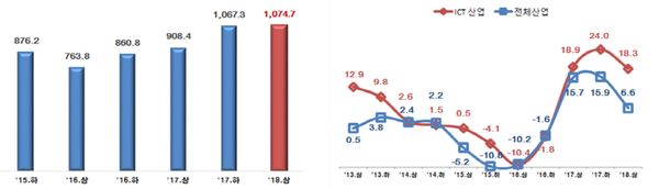 ▲ 최근 반기별 ICT수출액(억불)과 반기별 전체수출 및 ICT수출 증감률올 상반기 ICT(정보통신기술) 수출이 반도체, 컴퓨터 및 주변기기의 수출호조로 반기 사상 최대치를 기록한 것으로 나타났다.