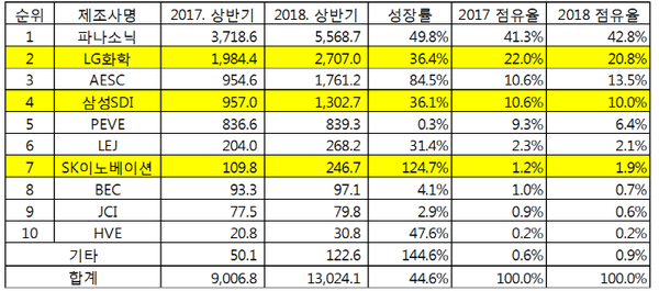 삼성SDI는 전년동기대비 36.1% 늘어난 1.3GWh를 기록했는데 성장률이 시장 평균보다 낮아순위와 점유율이 모두 하락했다. SK이노베이션은 전년동기대비 124.7%나 급증한 247MWh를 기록하면서 점유율이 0.7%p 올랐다.