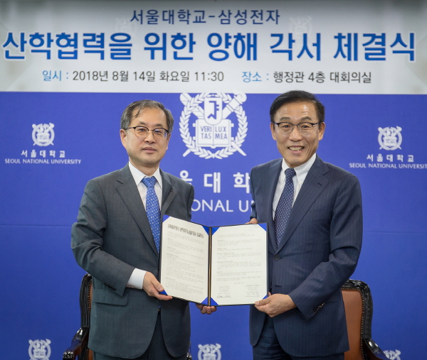 ▲ (왼쪽)서울대 박찬욱 총장 직무대리와 삼성전자 김기남 대표이사가 산학협력을 위한 MOU 체결 후 기념촬영을 하고 있다.삼성전자가 국내외 산학 협력 강화에 연간 총 1,000억원을 투입하고 그 첫걸음으로 서울대와 반도체 미래인재 양성을 위해 손을 맞잡았다.