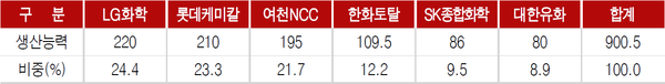 ▲ 국내 에틸렌 생산능력 현황(2018년 5월 기준, 단위 : 만톤)