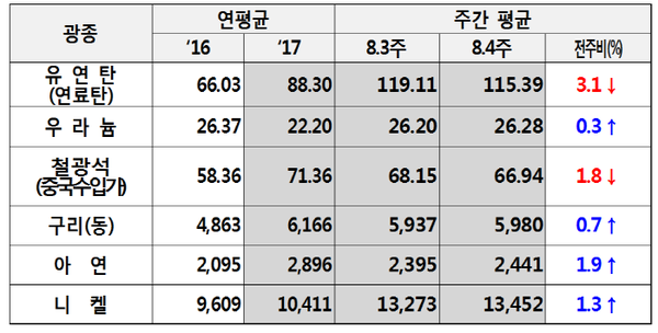 한국광물자원공사가 27일 발표한 8월 넷째주 주요광물가격 동향에 따르면 구리·니켈·아연 가격은 미·중 무역 갈등이 지속되고 있으나, 미 달러가치 하락, 재고감소 등 공급이슈, 중국의 인프라 투자확대 기대 등에 힘입어 반등했다.