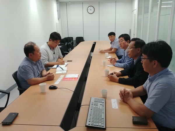 ▲ 나동희 충북도 태양광산업팀장, 전광호 충북도 주무관, 손현철 충북TP IT에너지센터장, 신국선 충북TP 팀장이 이승훈 수소융합얼라이언스추진단 사무총장, 이예빈 대리 등과 충북 수소 산업 발전 방향에 대한 의견을 교환하고 있다.충청북도가 태양광을 기반으로 한 수소 산업을 본격적으로 추진하기에 앞서 전문가 의견 수렴을 통해 수소산업의 올바른 발전 방향을 모색하는 자리를 가졌다.
