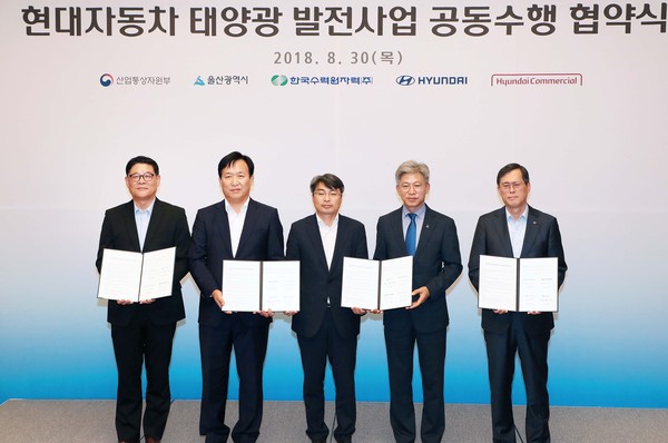 울산시, 현대차, 한국수력원자력, 현대커머셜 컨소시엄은 30일 울산롯데호텔에서 현대차 공장 내에 태양광 발전시설 설치를 위한 MOU를 체결했다.