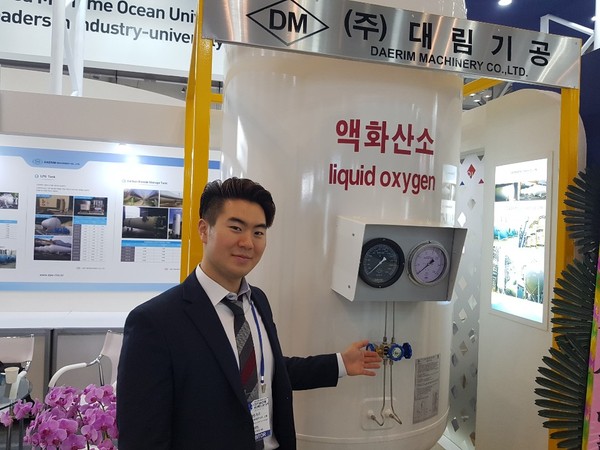▲ 하태형 대림기공 팀장이 전시회에 출품한 액화산소 저장탱크를 소개하고 있다.