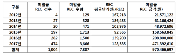 소멸된 REC는 RPS제도가 시행된 2012년 129REC(4건)에서 2017년 3,666REC(474건)으로 매년 증가추세에 있으며, 금액으로는 2012년 2,157만원에서 2017년 4억7,139만원으로 20배(21.8배) 이상 증가한 것으로 나타났다.