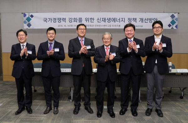 ▲ (왼쪽에서 네번째)권태신 한경연 원장과 발표자들이 기념촬영을 하고 있다.신재생에너지 산업이 일자리 창출과 혁신성장의 동력이 되기 위해서는 R&D 투자 확대와 산업생태계 조성을 통해 내수시장을 확충하고 수출로 이어지는 선순환 시스템 구축이 필요하다는 주장이 제기됐다.