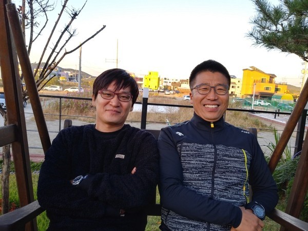 ▲ (오른쪽)채동기 영우회 회장과 김종혁 총무가 워크숍에서 기념촬영을 하고 있다.