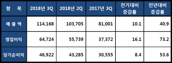 2018년 3분기 누적으로는 매출액 30조5,070억원, 영업이익 16조4,137억원, 순이익 12조1,421억원을 기록했다.