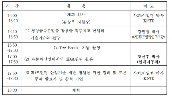 이에 △경량금속분말을 활용한 적층제조 산업의 기술이슈와 전망(강민철 3D프린팅연구조합 상임이사) △자동차산업에서의 3D프린팅 활용(조신후 현대자동차 책임연구원) 등이 주제발표되며, 이후에 3D프린팅 산업기술 개발 협업을 위한 질의 및 토론이 진행된다.