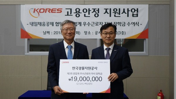 ▲ 30일 한국광물자원공사 대회의실에서 남윤환 광물공사 사장직무대행이 김영범 광업협회 회장에게 우수 근로자 자녀 장학금을 전달하고 있다.한국광물자원공사(사장직무대행 남윤환)가 국내 자원업계 일자리 창출 및 중소기업 일자리 안정화에 나선다.